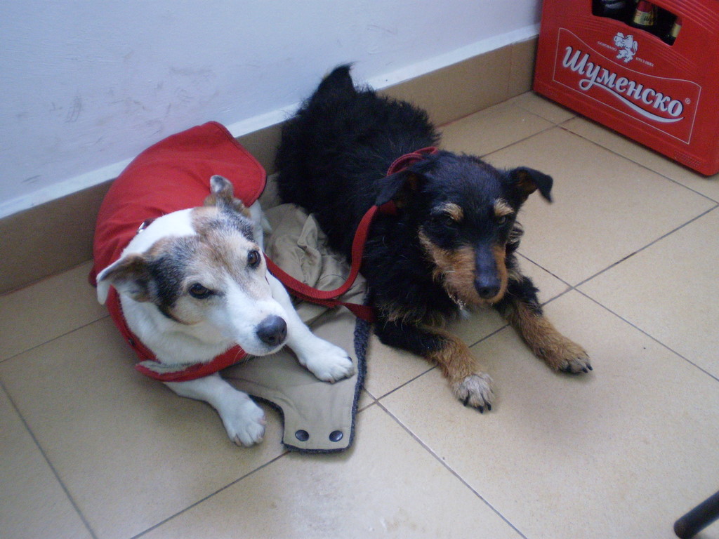 Oppi-dog & Mister Pip brotherly on the floor in Regina's humble village store - Ahryansko Bulgaria 2011